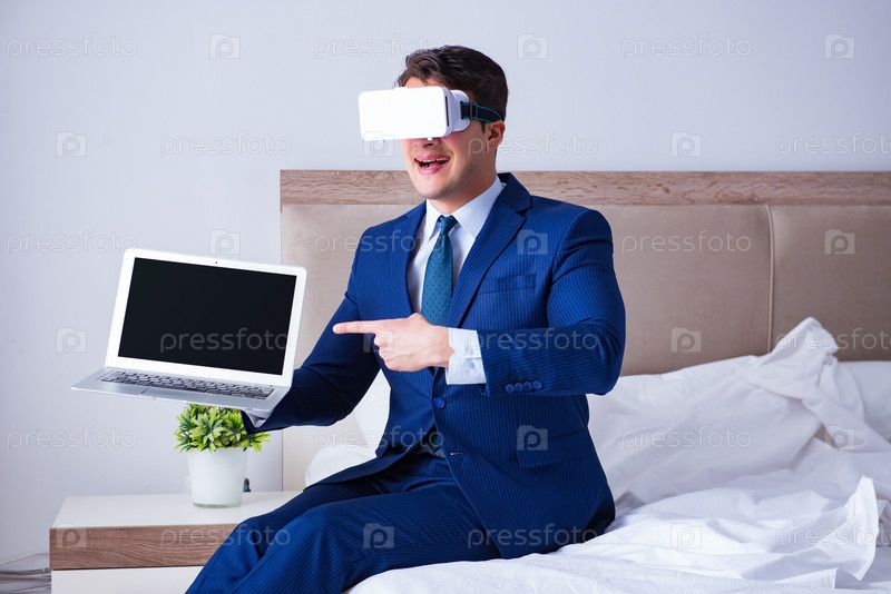 Бизнесмен, носящий гарнитуру виртуальной реальности в спальне