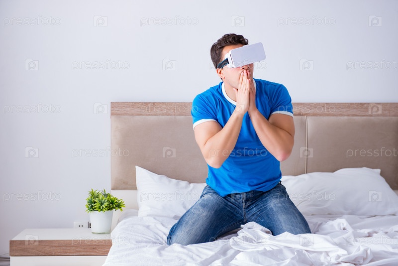 Молодой человек в постели, носящий VR-головной аппарат виртуальной реальности