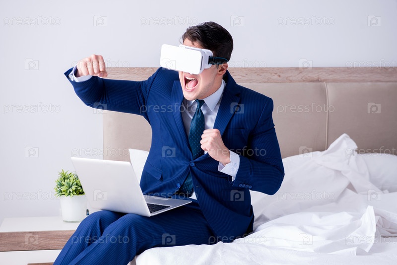 Бизнесмен, носящий гарнитуру виртуальной реальности в спальне