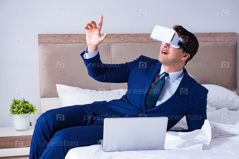 Бизнесмен, носящий гарнитуру виртуальной реальности в спальне