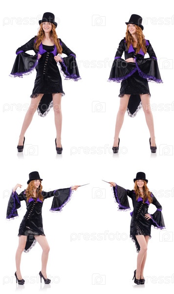 Красивая девушка в фиолетовой карнавальной одежде и шляпе изолирована на белом