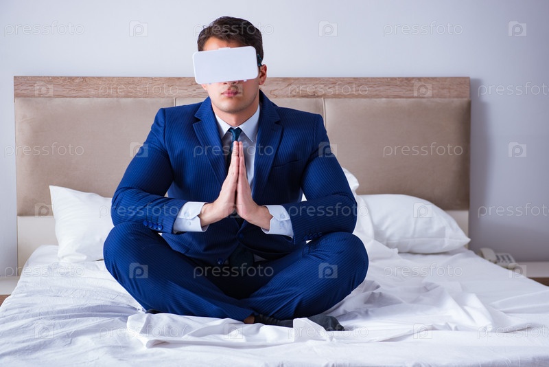 Бизнесмен, носящий гарнитуру виртуальной реальности в спальне