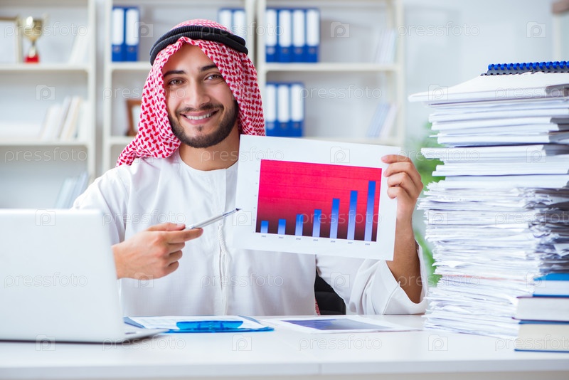 Арабский бизнесмен, работающий в офисе и выполняющий бумажную работу с пи