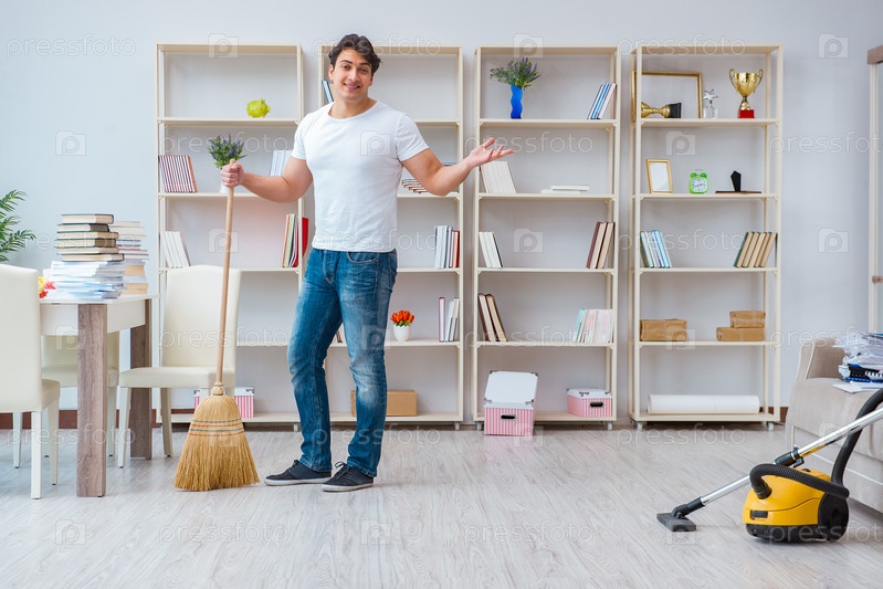 Мужчина убирает дома