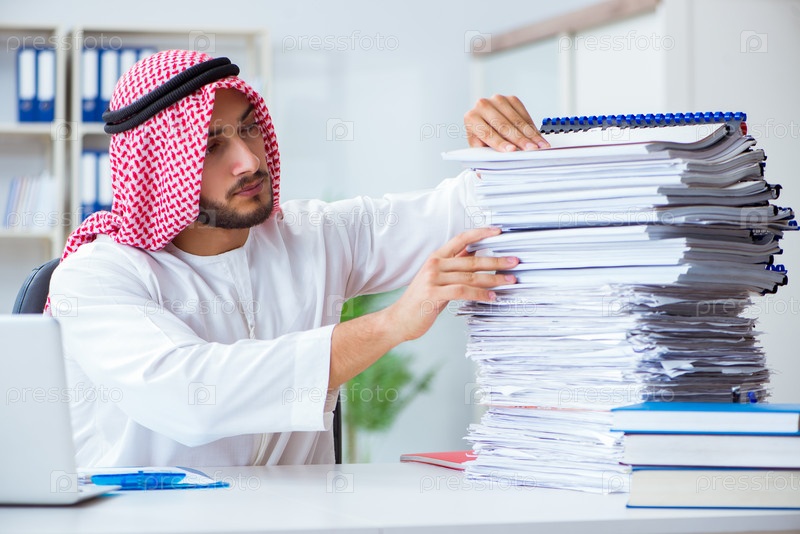 Арабский бизнесмен, работающий в офисе и выполняющий бумажную работу с пи