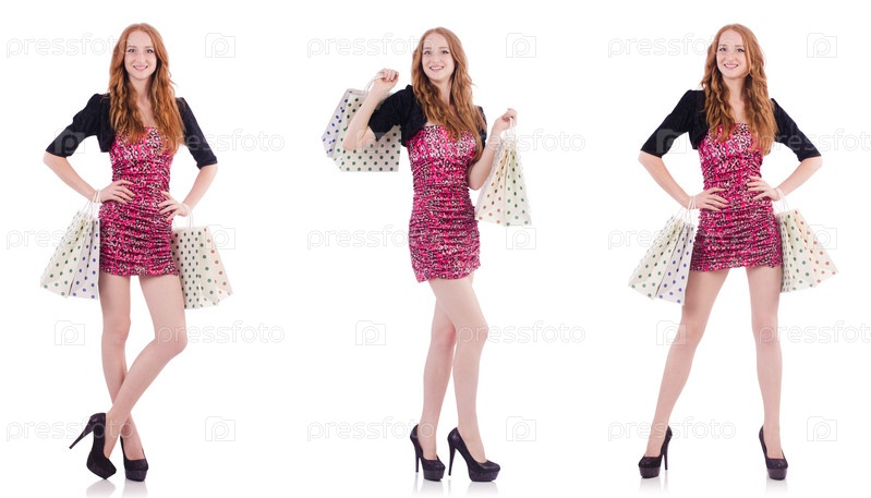 Девушка после хороших покупок на белом