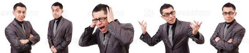 Молодой человек в сером костюме изолирован на белом