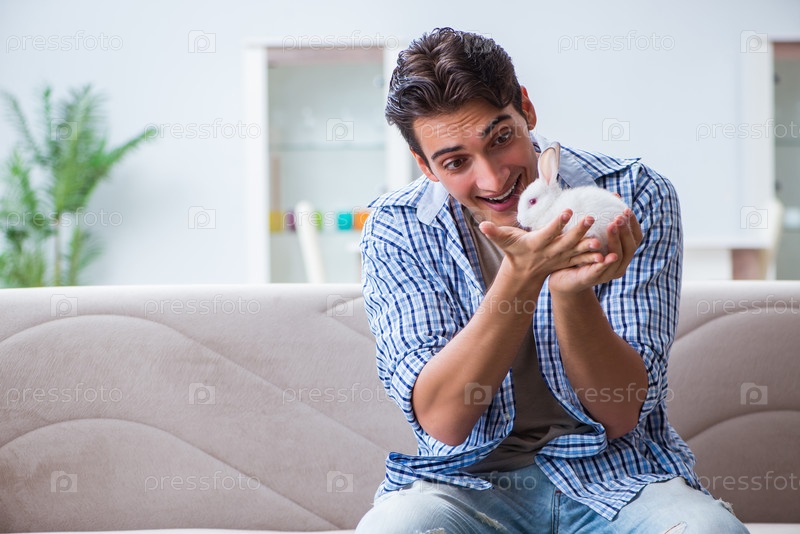 Молодой человек играет с домашним кроликом дома