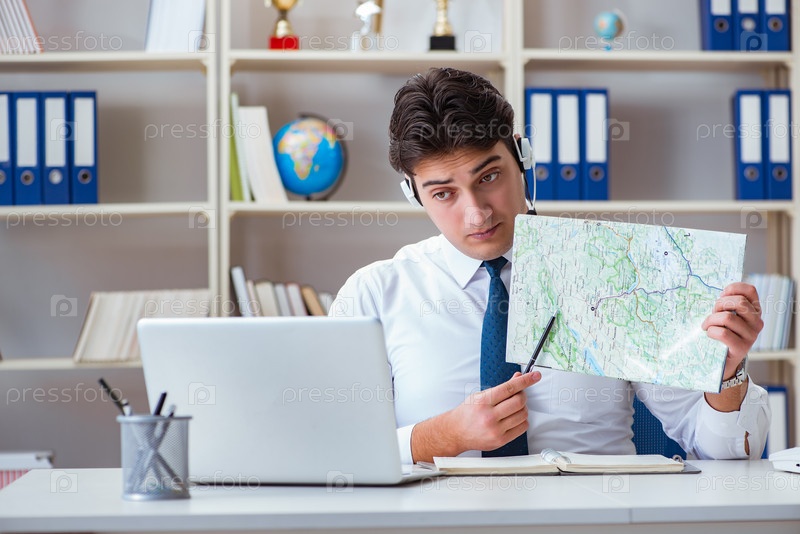 Бизнесмен оператор туристический агент, работающий в офисе