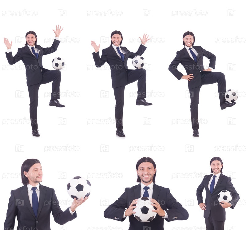 Белый мужчина с футболом изолированный на белой