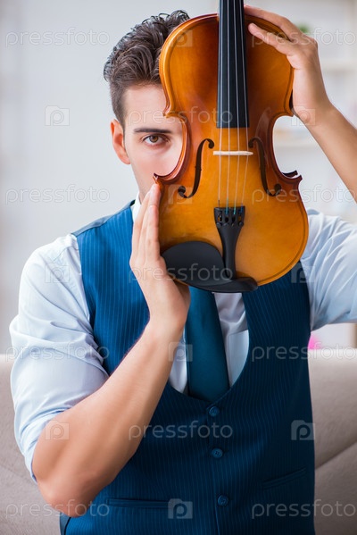 Молодой музыкант-мужчина практикуется играть на скрипке дома