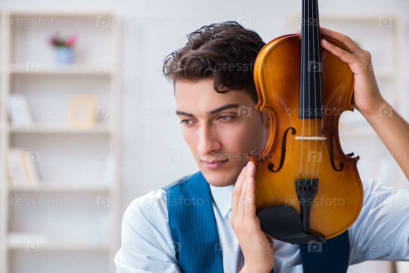 Молодой музыкант-мужчина практикуется играть на скрипке дома