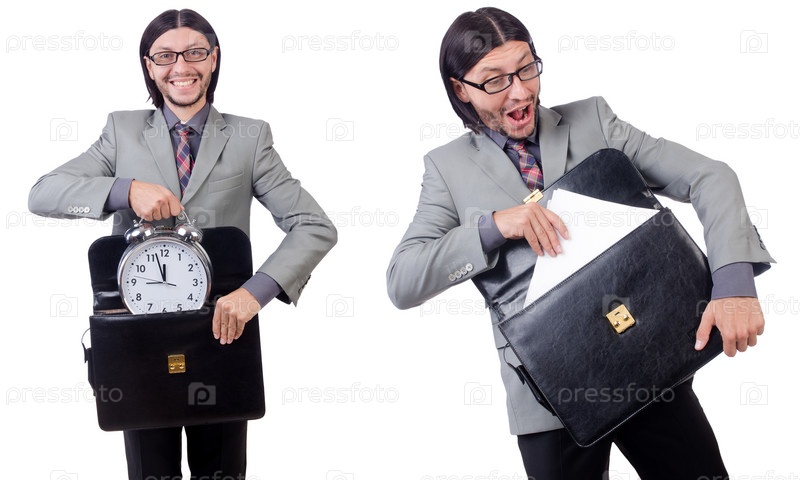 Молодой бизнесмен в сером костюме держит портфель, изолированный на улице