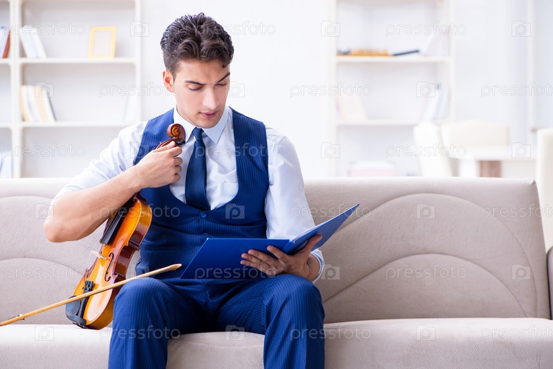 Молодой музыкант-мужчина практикуется играть на скрипке дома