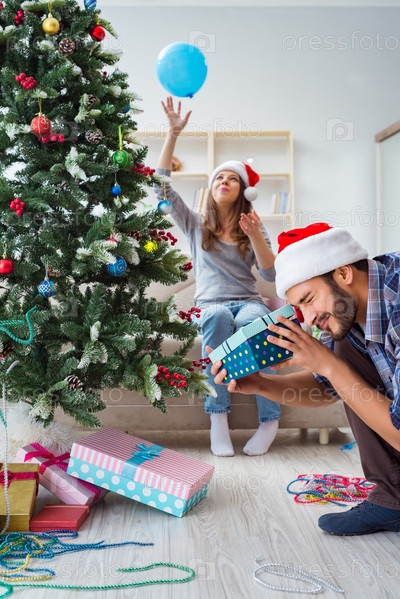 Девушка и парень открывают рождественские подарки