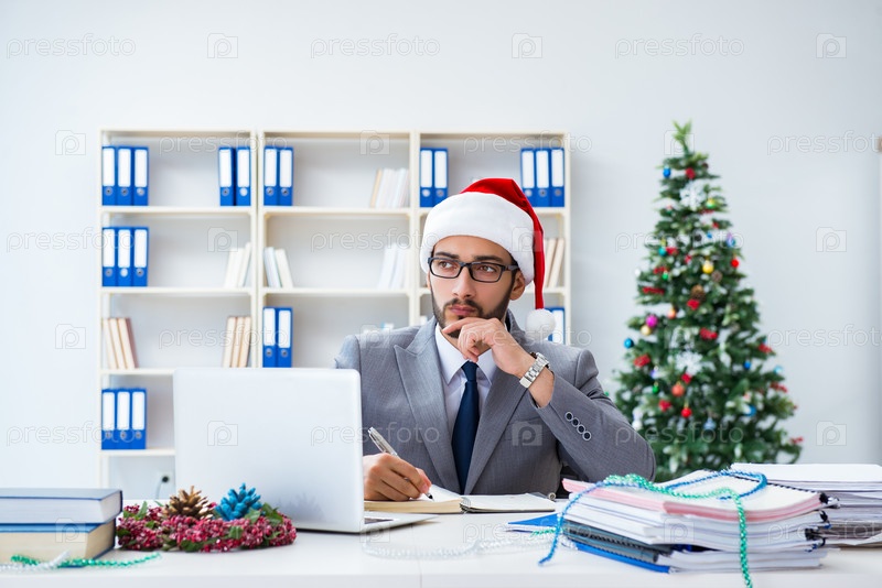 Молодой бизнесмен празднует Рождество в офисе
