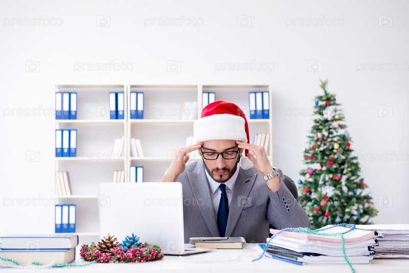 Молодой бизнесмен празднует Рождество в офисе