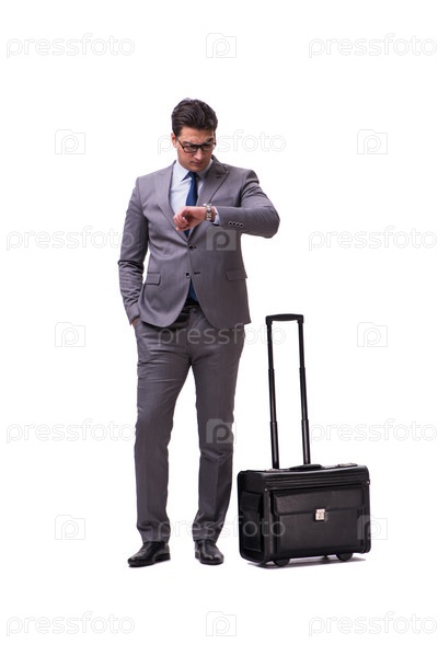 Молодой человек во время деловой поездки изолирован на белом