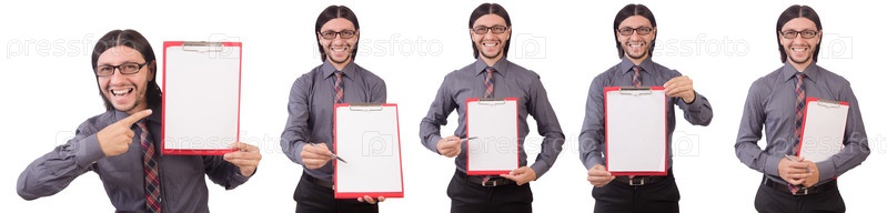 Молодой бизнесмен с бумагой, изолированной на белом