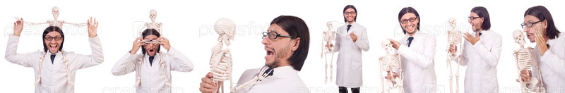 Забавный учитель со скелетом, изолированным на белом