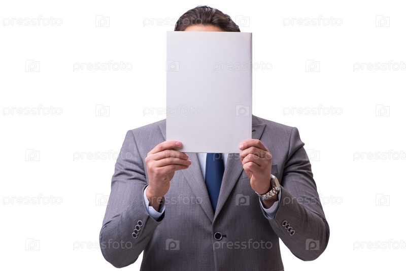 Бизнесмен с пустой доской сообщений, изолированной на белом