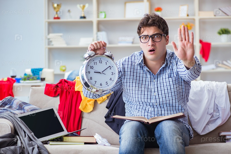 Молодой человек работает, изучая в беспорядочной комнате