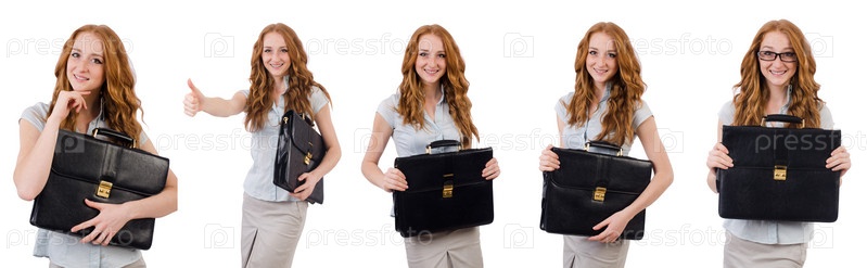Красивая молодая сотрудница с портфелем, изолированным на белом