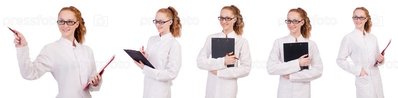 Молодой студент-медик пишет на папке, изолированной от белого