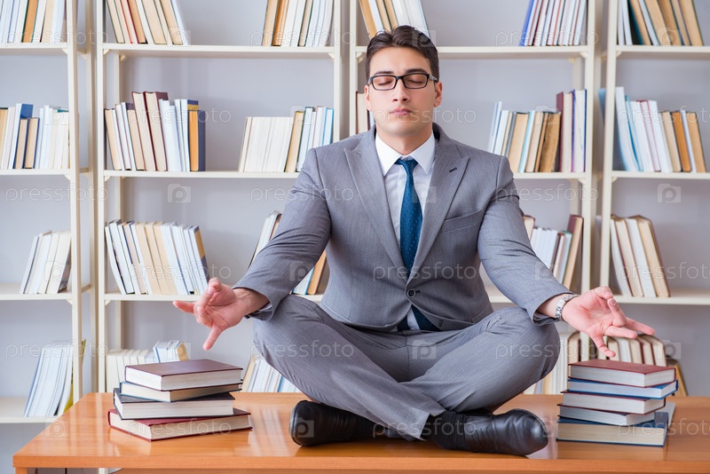Студент-бизнесмен в положении лотоса, концентрирующийся на библиотеке