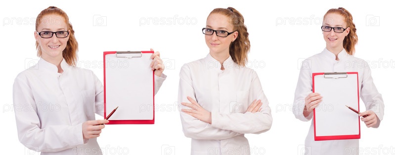 Молодая студентка-медицинская с объединителем, изолированным на белом