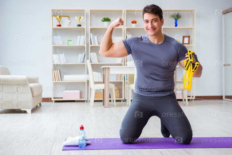 Молодой человек тренируется дома в спорте и здоровом образе жизни с