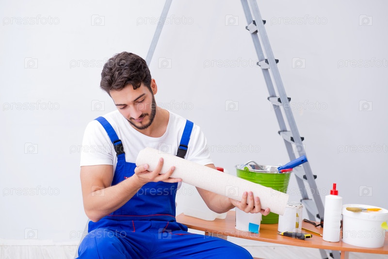 Ремонтник, выполняющий ремонтные работы в доме с бумажной оболочкой