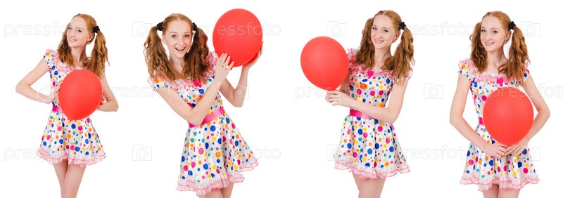 Молодая женщина с красным воздушным шаром изолирована на белом