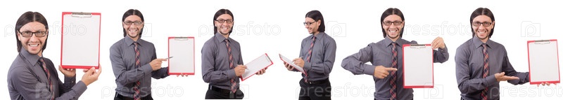 Молодой бизнесмен с бумагой, изолированной на белом