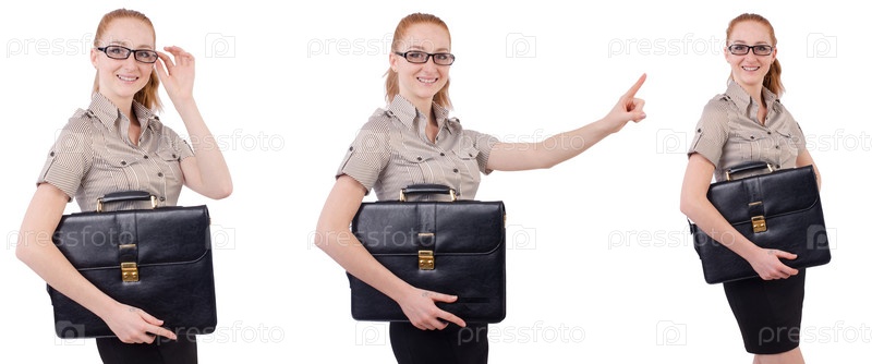 Красивая молодая сотрудница с портфелем, изолированным на белом
