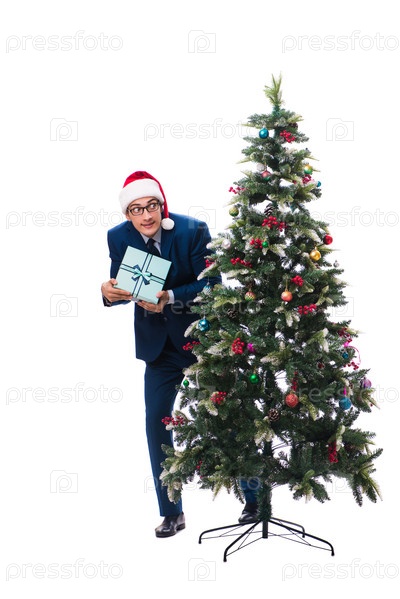 Бизнесмен украшает рождественскую елку изолированно на белом