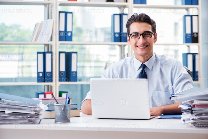 Бизнесмен с чрезмерной рабочей бумажной работой, работающий в офисе