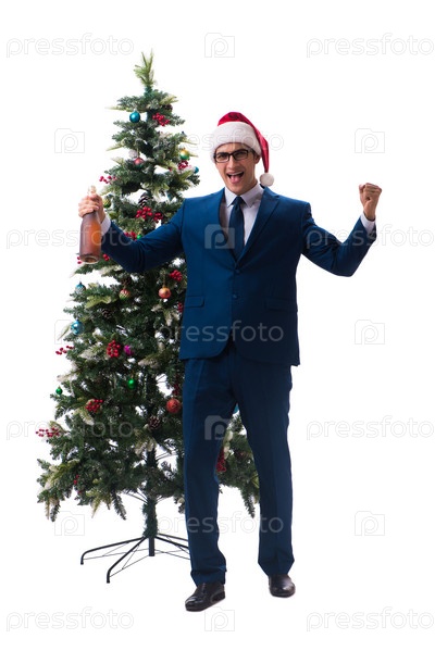 Бизнесмен украшает рождественскую елку изолированно на белом