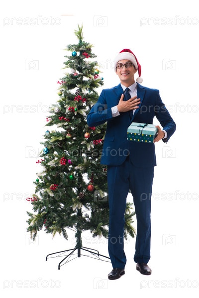 Бизнесмен украшает рождественскую елку изолированно на белом