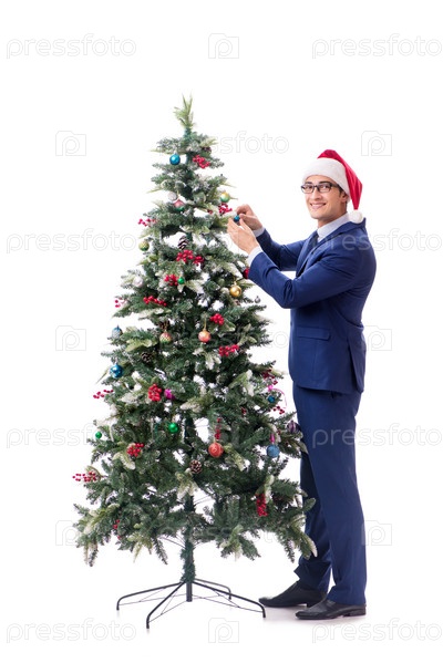 Бизнесмен украшает рождественскую елку изолированно на белом