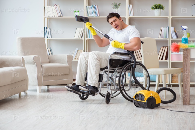 Инвалид с пылесосом дома