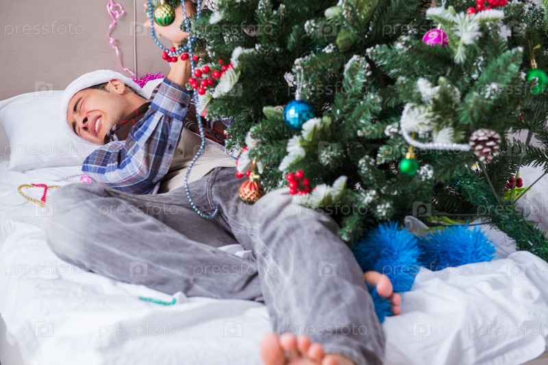 Мужчина страдает похмельем после рождественской вечеринки