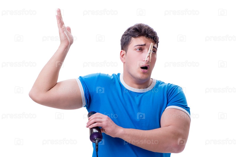 Мужчина, чрезмерно потеющий и плохо пахнущий изолированный на белом фоне