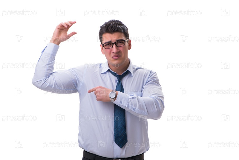 Бизнесмен чрезмерно потеет, плохо пахнет и изолирован на белом
