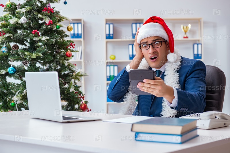 Бизнесмен празднует рождественские каникулы в офисе
