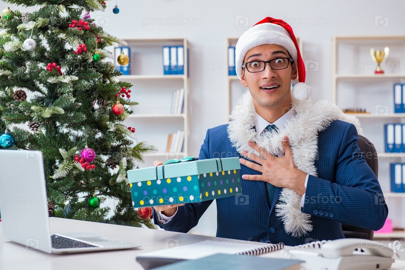 Бизнесмен празднует рождественские каникулы в офисе