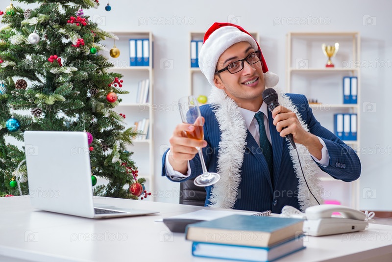 Бизнесмен празднует рождественские каникулы в офисе