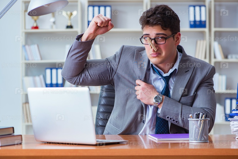 Бизнесмен чрезмерно потеет и плохо пахнет в офисе на работеp