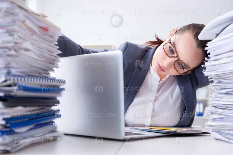 Уставшая деловая женщина с бумажной нагрузкой