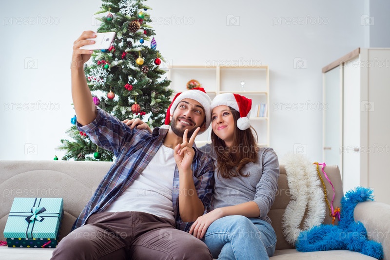 Молодая пара делает селфи во время Рождества